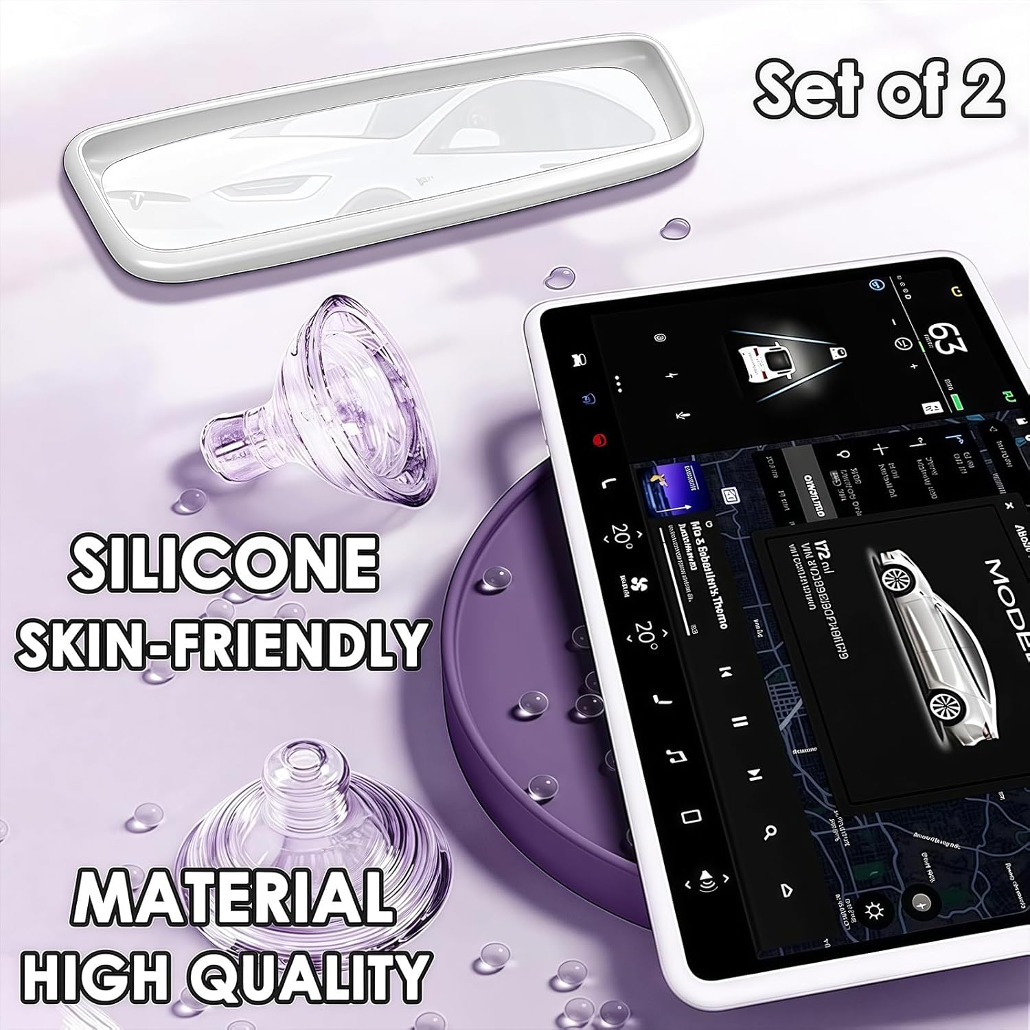 2PCS Protector Trim Frame Compatible with Tesla Model 3 Y 2020-2024 2026 Screen Edge Frame Rearview Mirror Cover Interior Silicone Decorations Center Console Decor Highland Juniper Accessories (White)