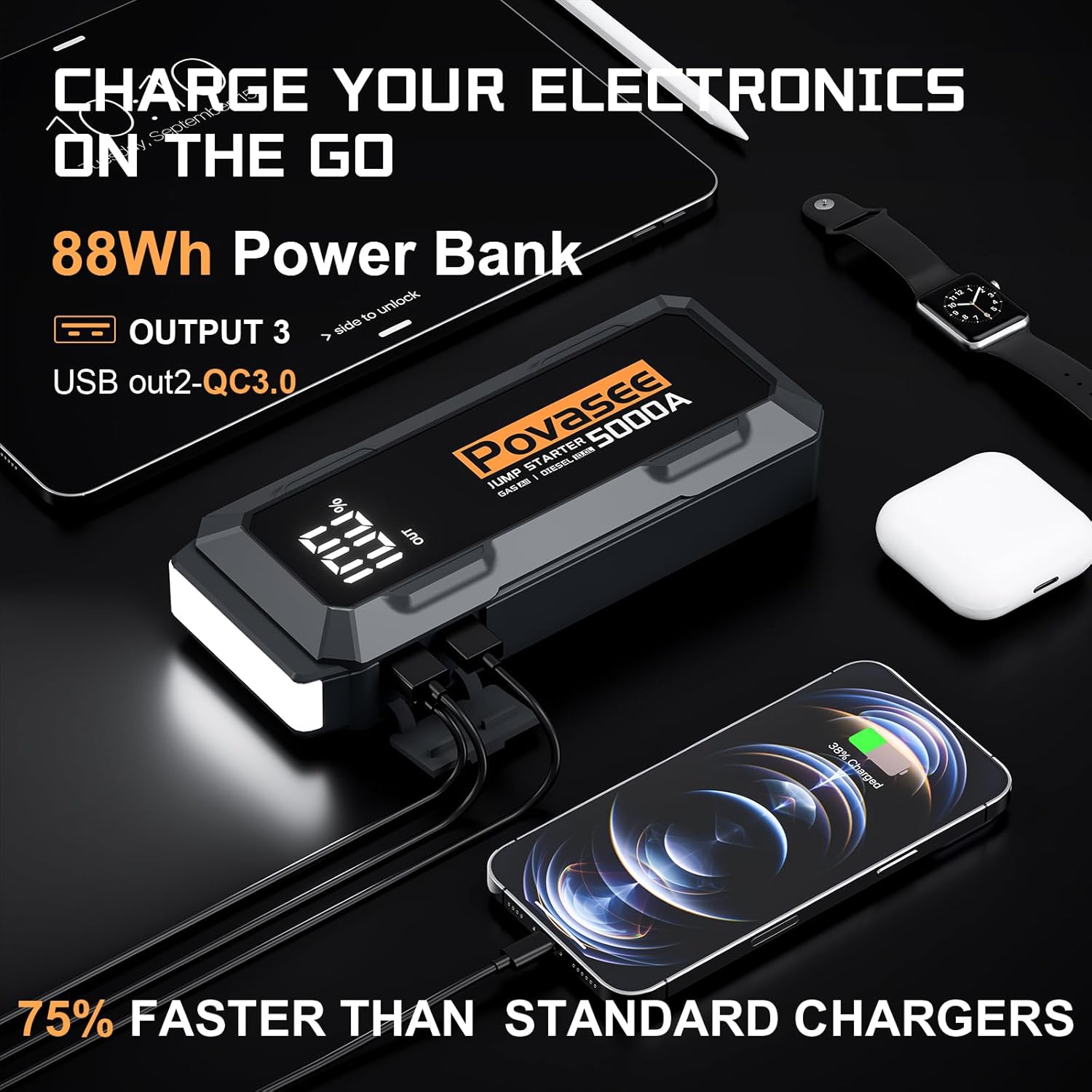 5000A Jump Starter Povasee A40 Car BatteryJump Starter, 12V Jump Box for Car Up to All Gas or 10L Diesel Engine Battery Jumper Starter Portable with 3″ LCD Display Power Bank/Dual Output/LED Light