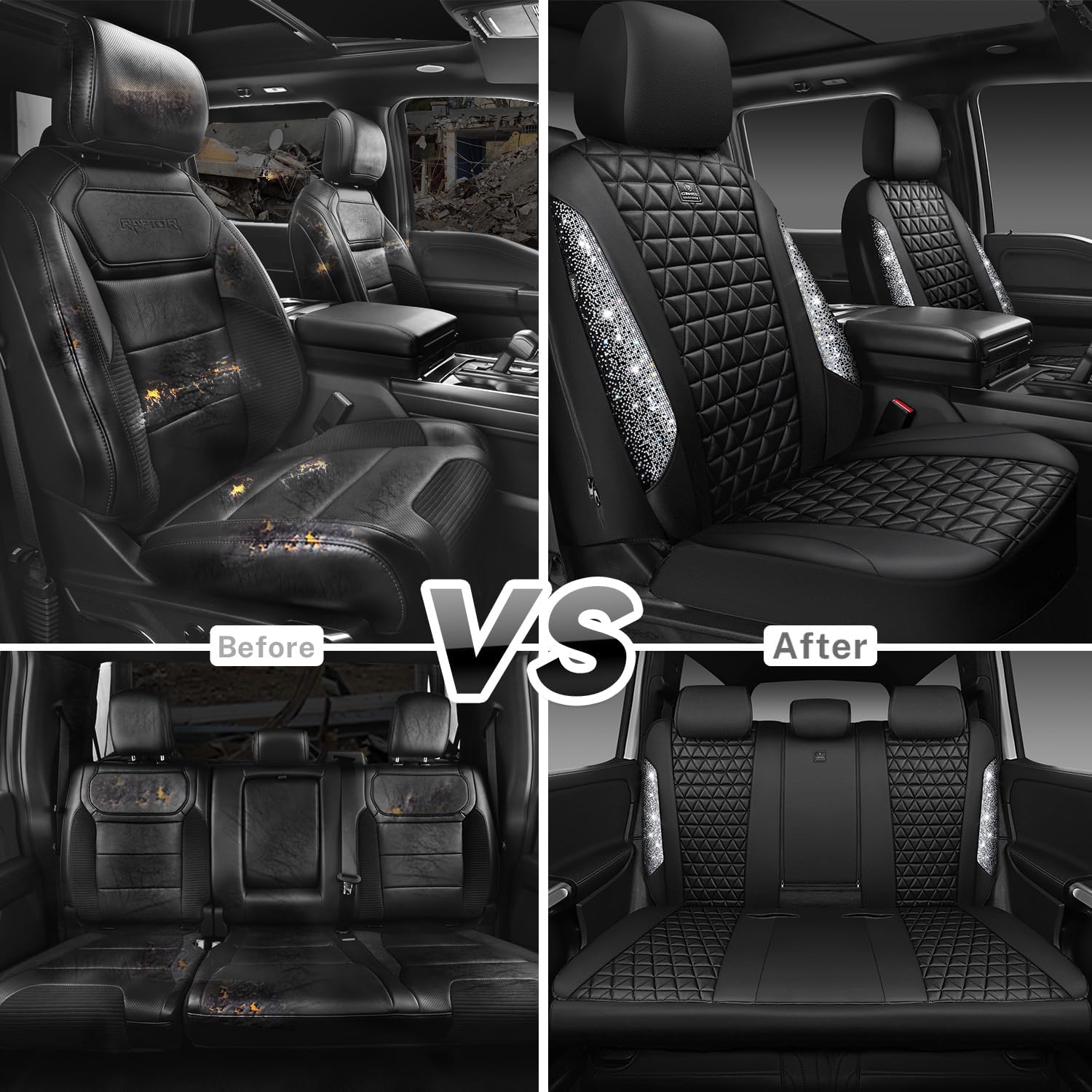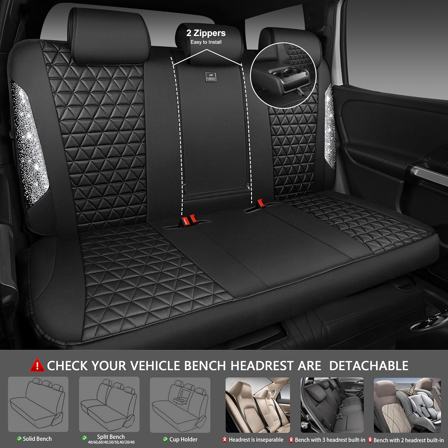 CAR PASS Bling Diamond Leather Car Seat Covers Full Seats Interior Sets, Waterproof Shining Glitter Sparkly Crystal Universal Armrest Fit Automotive Truck SUV Cute Women Girl, Black Silver Rhinestone