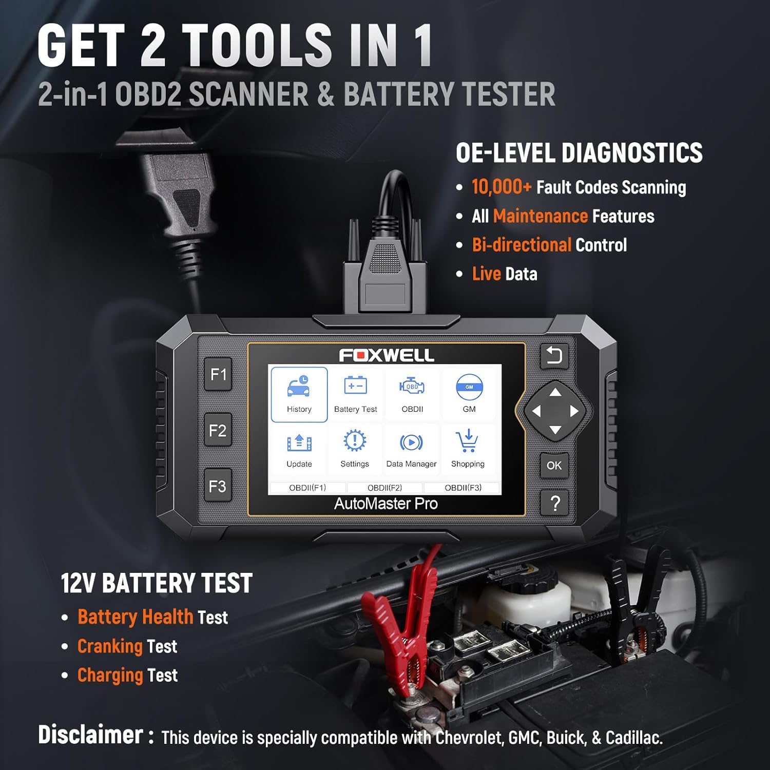 FOXWELL NT510 Pro fit for GM Scan Tool, 2-in-1 OBD2 Scanner & 12V Battery Tester, All Systems Diagnostic & Bi-Directional Control, Crankshaft Sensor Relearn, fit for Chevrolet Buick Cadillac GMC