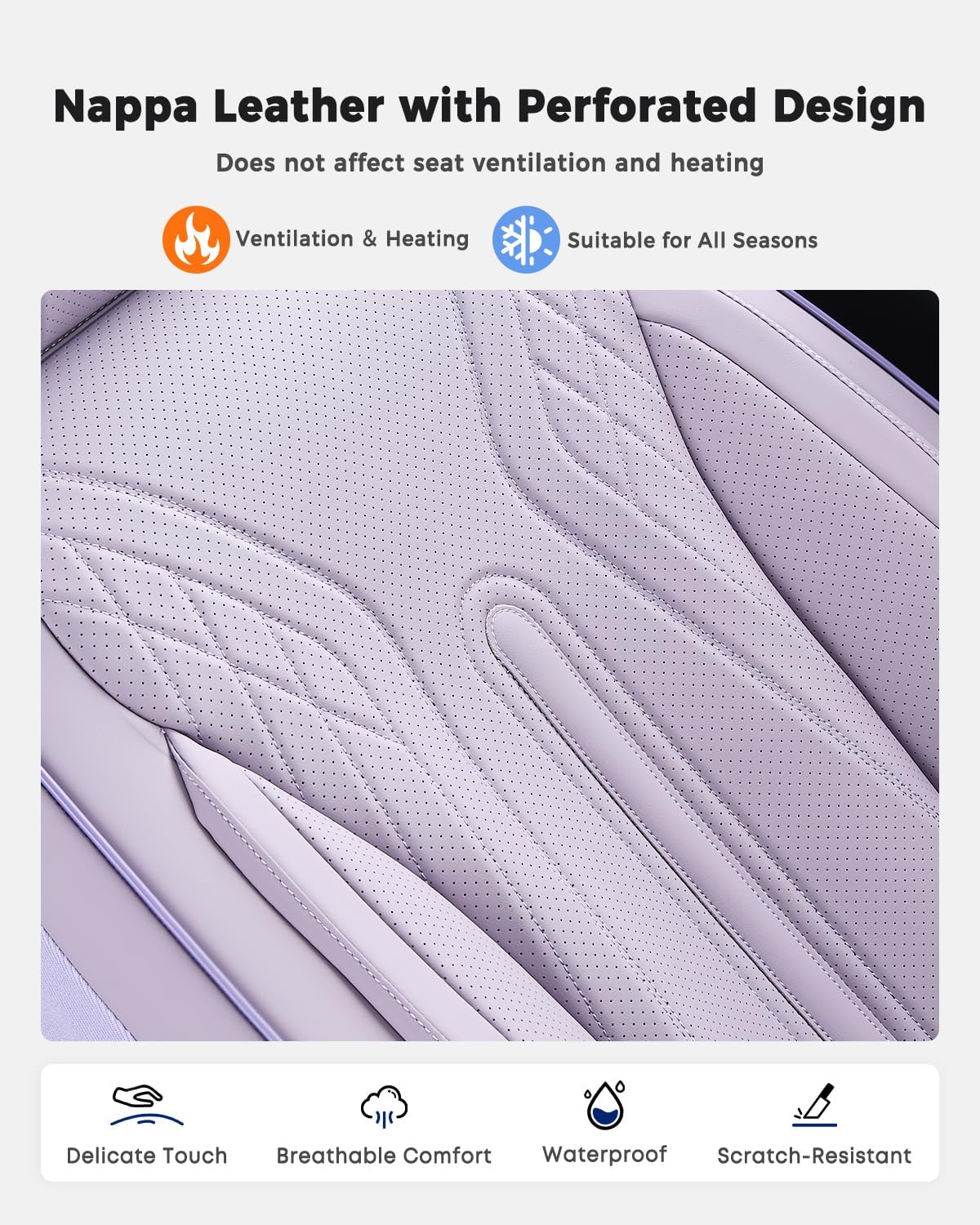 Huidasource Car Seat Covers Full Set, Universal Fit for Most Cars SUV Trucks, Full Coverage Nappa Leather Seat Cover, Airbag, Cupholder Compatible, Velcro Adjustable,Seat Function Retain, Light Purple