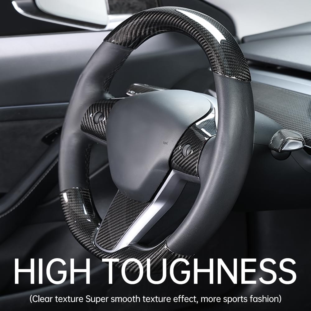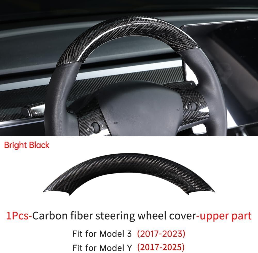 JSWAN Real Carbon Fiber Steering Wheel Cover for Tesla Model 3 2017 to 2023 Model Y 2020 to 2024 Steering Wheel Cover Steering Wheel Wrap Protector Interior Accessories (Bright Black Upper Part)