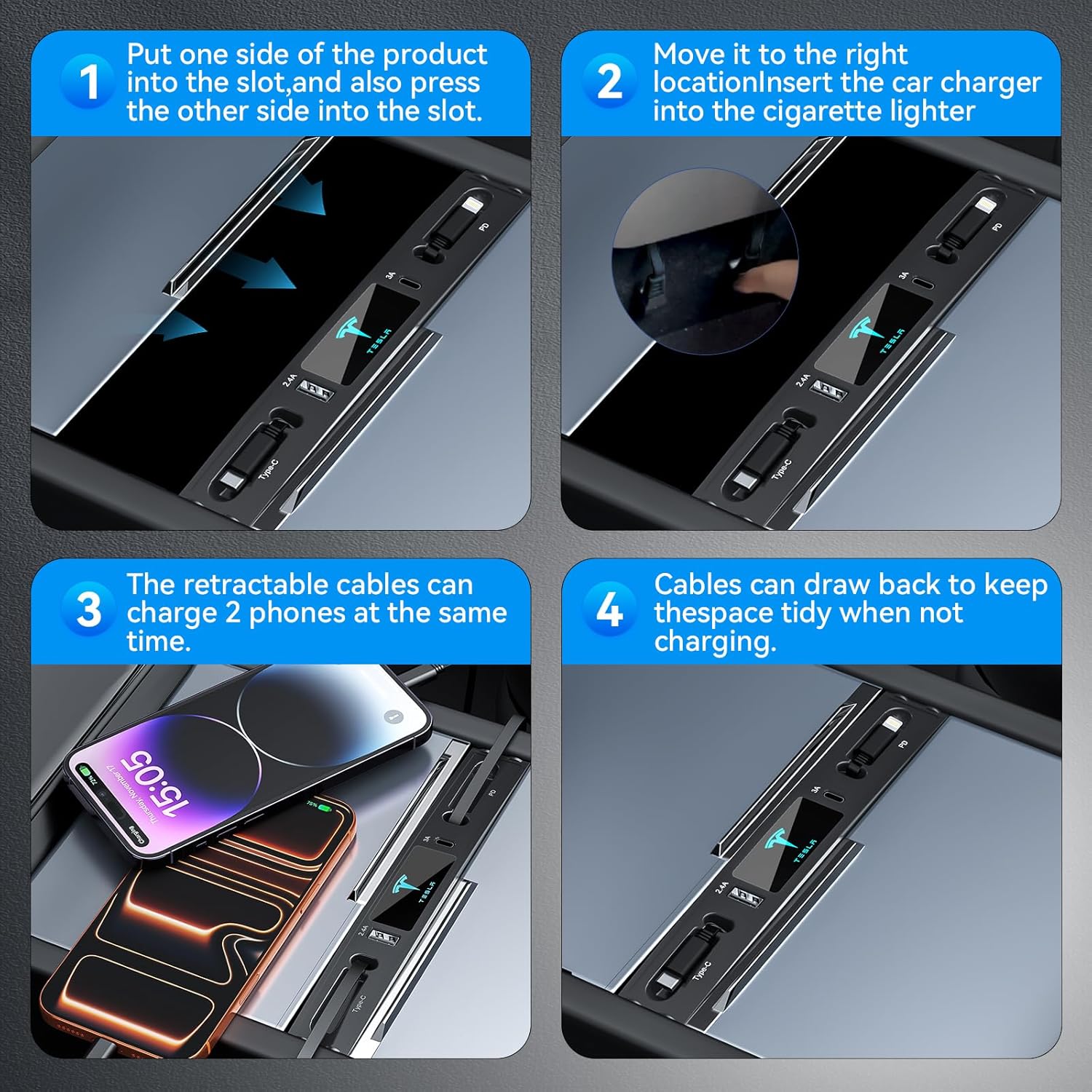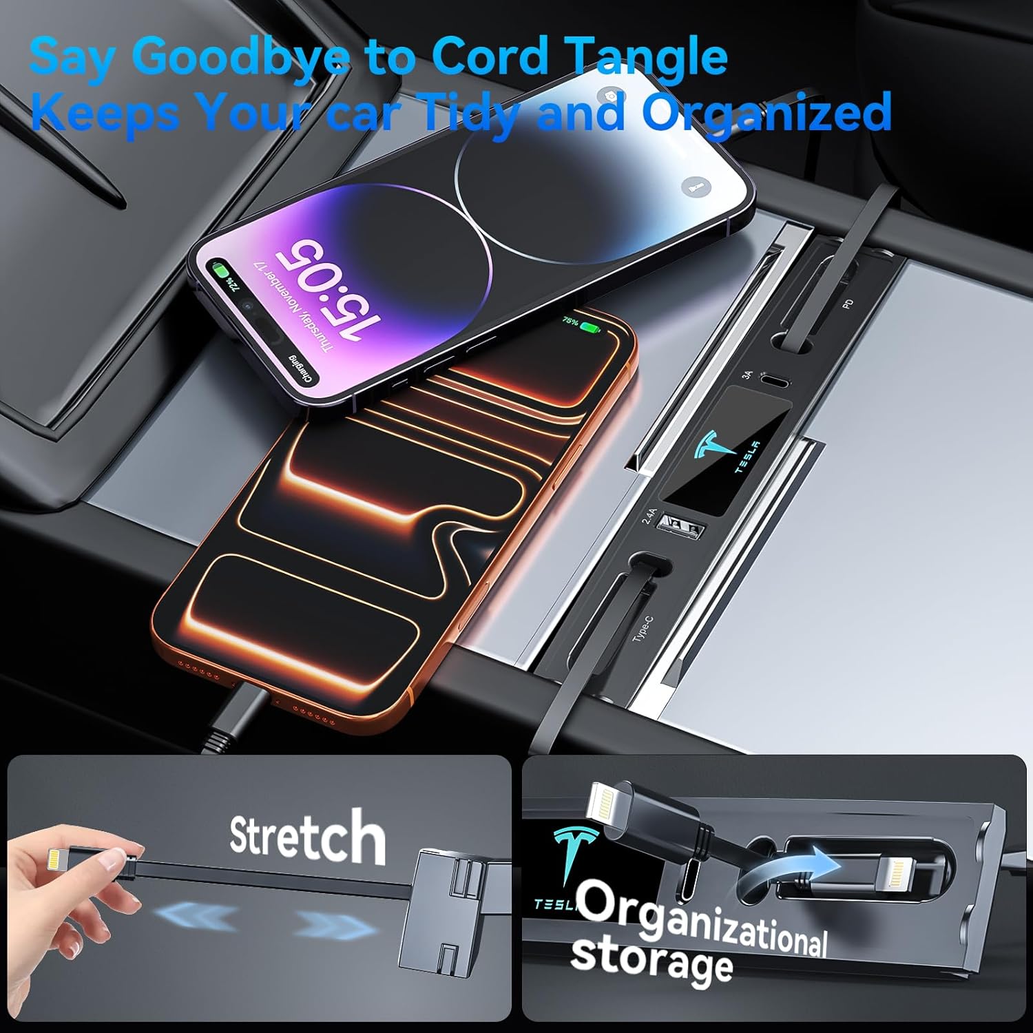 USB Hub for Tesla Model 3 Model Y, Waterproof, Multi Port Fast Charging for Model Y/3 Accessories 2021-2024, Retractable Docking Station with Built-in Cables, Fit Center Console(Not Fit Model 3 2024)