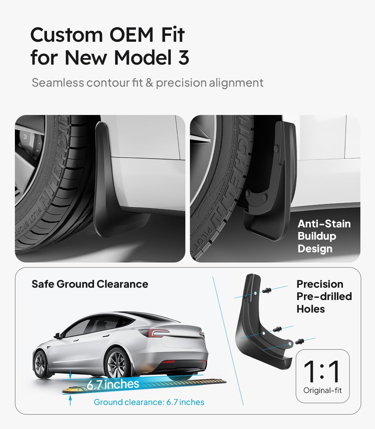 Wigoo 2026 New Tesla Model 3 Accessories Mud Flaps [Stay Clean, Protect Paint] All Weather Splash Guards with Install Kit, for Model 3 2024 2025 2026 Highland, Upgraded Version, Black (Set of 4)